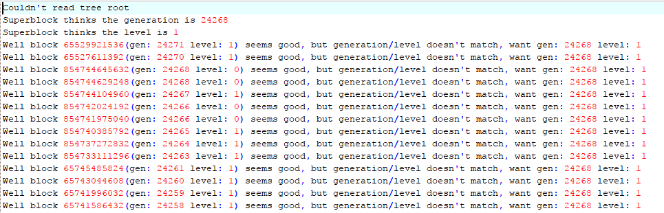 我们需要用到的数据是 Well block 后面的这一串数字,其后的 gen 数字越高,恢复的可能性越大。下一步使用找到的 tree root 来模拟修复,到目前为止的所有操作都不会对硬盘进行写入和修改,也不会破坏任何数据。