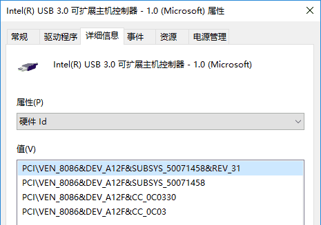 如不清楚硬件 id ,可先引导至 Windows 并通过设备管理器查看。如图所示,这个 Intel USB 3.0 控制器的硬件 id 为:8086:A12F。